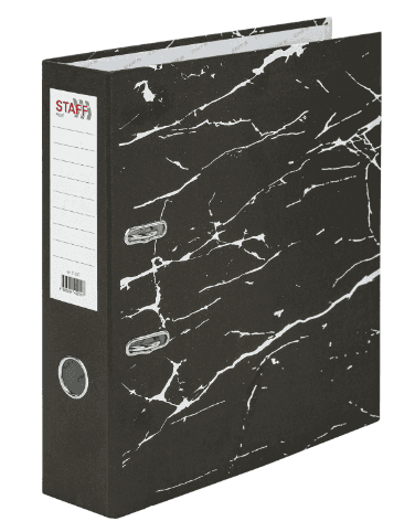 Папка формата А4 с вертикальной ориентацией изготовлена из высококачественного износоустойчивого картона с покрытием под "мрамор". Ширина корешка 75 мм позволяет разместить до 500 листов. Прорези для колец на внешней крышке позволяют папке оставаться закрытой даже при большом количестве бумаг, а надежный арочный механизм легко справляется с ежедневными нагрузками. Корешок снабжен этикеткой для маркировки содержимого, что позволяет структурировать информацию.