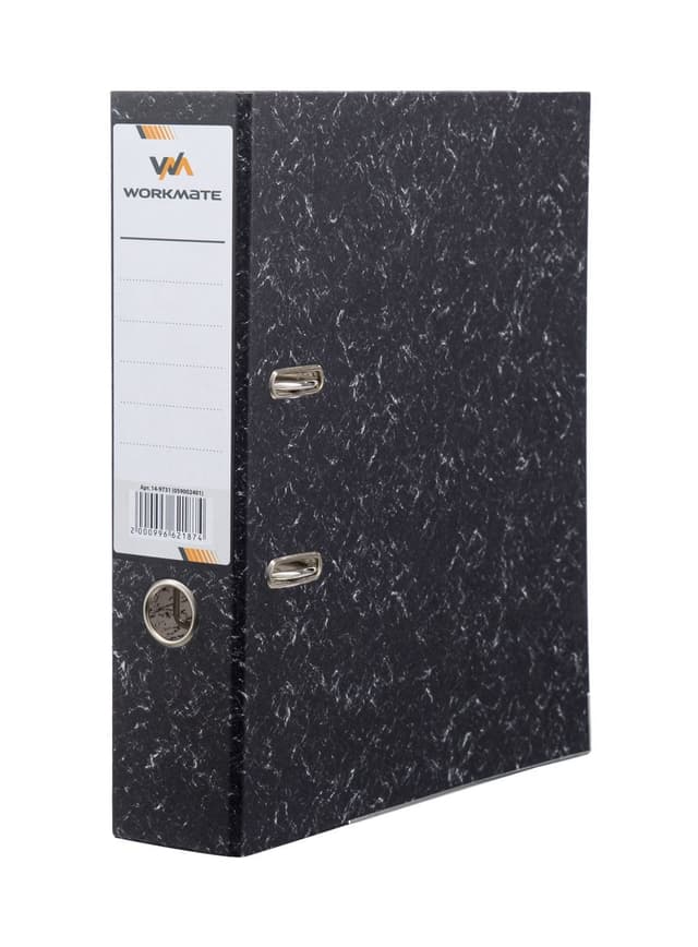 Папка - регистратор Workmate выполнена из плотного картона черного цвета с ПП пленкой. Корешок оснащен прозрачным карманом со съемной этикеткой для маркировки содержимого и металлическим кольцом для захвата папки. Ширина корешка 75 мм. Металлический уголок увеличивает срок службы папки. Вместимость папки до 500 листов формата А4 стандартной плотности. Прорези на лицевой стороне позволяют удерживать папку в закрытом состоянии при большом количестве вложенных бумаг.