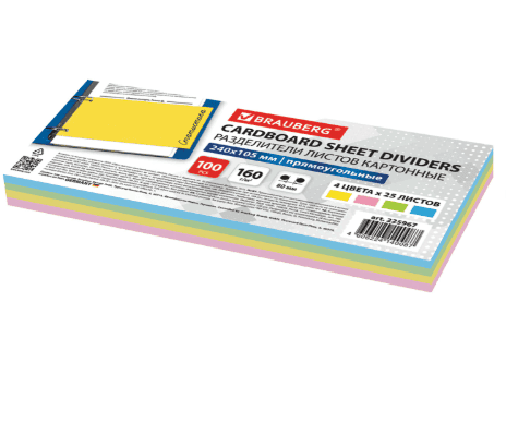 Изготовлены из качественного картона плотностью 160 г/м2. В комплект входят 100 листов размером 240х105 мм синего, красного, зеленого и желтого цвета, обеспечивающих возможность сортировки документов по цветам. Универсальная перфорация позволяет подшивать разделители во все типы папок.