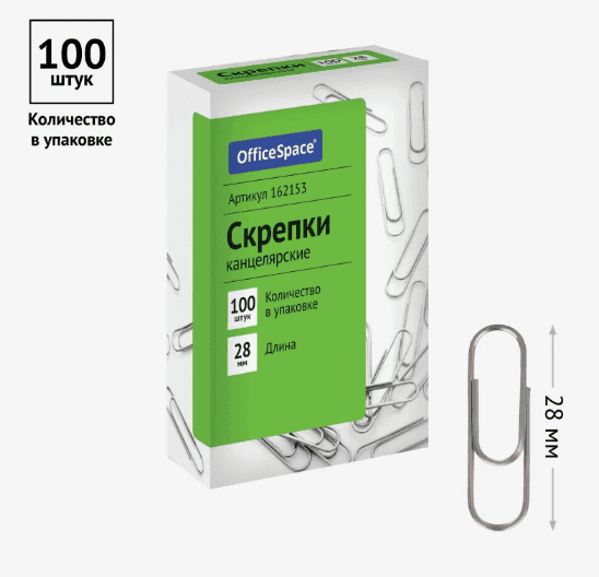 Скрепки 28мм, OfficeSpace, карт. упаковка (100шт/уп)