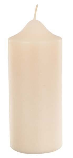 Свеча выполнена в классическом белом цвете и имеет цилиндрическую форму.